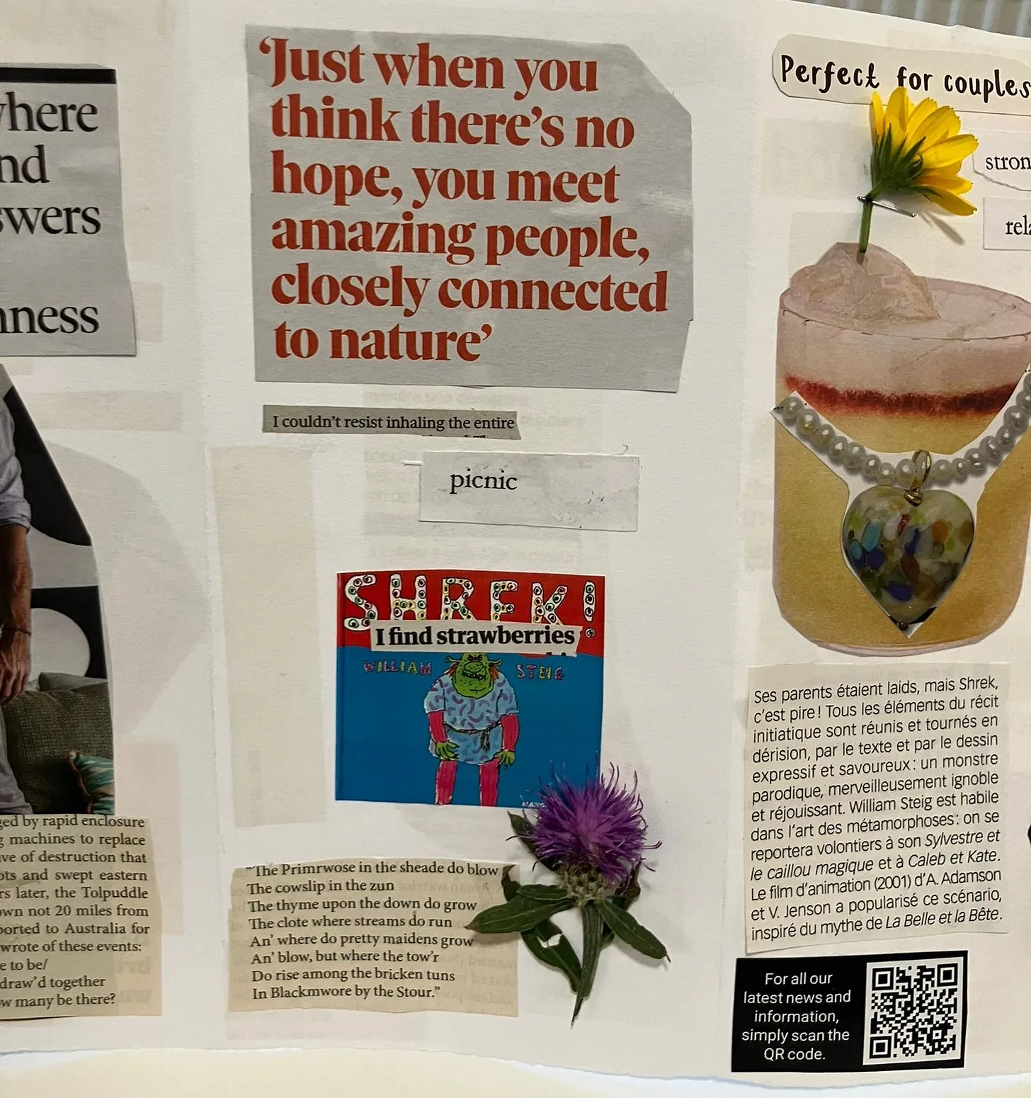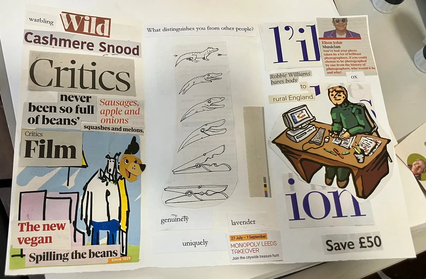 The same applies to the making of mosaic leaflets, a process of cutting and sticking together disparate narratives to form a chaotic whole. I giggled on that afternoon making leaflets in a breathless and giddy way, imagining the different nonsensical possibilities. Armed with tiny scissors, glue, a bucket of nouns, a spade of adjectives, French magazines, and dozens of leaflets from tourist attractions across York and the North of England, I sat in the square side room of a church in a residential square on a rainy day. I tried to include a brown leaf in my leaflet, but they were all too sodden to stick. I mined the materials without reason, in my flow/play/happy state where I don’t think about what I’m thinking. In this way, three hours flew by.